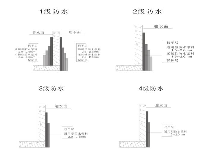 地下室防水材料材料选用:水泥基渗透结晶防水涂料或K11通用型防水涂料,一级防水2.0-2.5mm ,二级防水1.5-2.0mm,三级防水2.0-2.5mm,四级防水,1.5-2.0mm